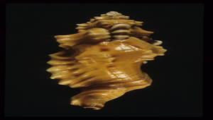 形態特徵:貝殼大型,黃橙色,有發達的粗瘤和縱脹肋,殼口上方有黑斑,殼長12cm