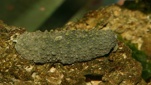 形態特徵:無殼,外觀呈長橢圓狀,膨脹。外套膜為黃綠色的底,其上密佈灰黑色斑。體表密佈大小不一的瘤突。前端具觸角一對,頂端有眼點。腹足灰綠色。