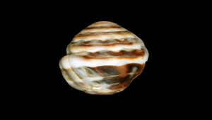 形態特徵:殼約略呈菱形,深紫褐色,上面有白色橫帶,橫帶上下有較淺的褐色橫帶。縫合線下方有肩部,殼體上縱肋約十條,肋與肋間的殼體十分平滑。殼口橢圓形,軸唇上有兩齒,為黃褐色,外唇完整,紫褐色與白色相間。