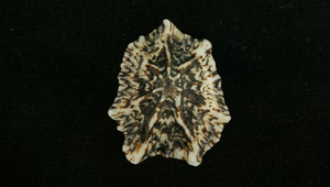 形態特徵:殼呈星狀笠螺形,殼頂尖銳,約具7條粗放射肋,肋突出殼緣,肋間有2-3條小肋。殼表黑褐色,殼頂與放射肋為白色,殼內深褐色,中心為白色,陶質,具光澤。