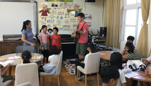在英文課中,除了聽、說、讀、寫之外,透過有趣的英文歌曲讓學生對字母、單字能加深印象,教室使用專業級的麥克風,讓學生邊學、邊唱,也能透過麥克風錄製出自己的好聲音、好音樂。