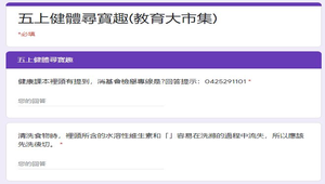 利用Google 表單設計尋寶遊戲,並加入回答驗證,讓小朋友從健康與體育課本中找出問題的答案。
