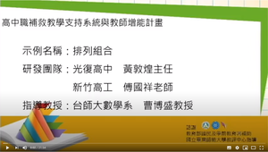 本示例以鷹架理論和診斷教學作為教學策略。於前測時紀錄學生運算方式,並請學生說明理解與運算的過程,讓教師診斷出學生學習上的困難;接著請學生閱讀排列組合之學習重點(鷹架),最後再破除學生學習上之迷思(影片展示),產生補救教學效果。後測試題顯示本示例實施成效良好,學生學習後不只成績顯著上升,更提高其對學習數學之自信心。