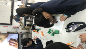 利用65吋大型電視螢幕配合實物投影機,以及使用小積木進行視圖與製圖教學。