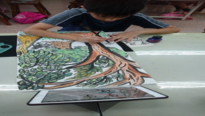 利用平板電腦拍下校園裡能看到的樹種,帶回教室進行水墨創作。