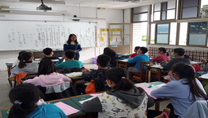 教師利用資訊設備將學童的作品與即時討論的小組結果,將之傳至教師電腦,利用投影機,在個人與分組進行報告將相關內容投射在布幕上,