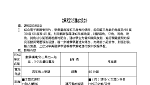 透過量角器和三角板的使用,能知道三角板的角度為90度30度60度和45度。:判斷直角、平角、周角、銳角、鈍角以小組競賽遊戲的配合,提高學習興趣;讓孩子可以歸納統整,當孩子測量不同大小實,能以90度為參考點,分辨出各個角度,並且藉由這些綜合題型深化概念,應用在日常生活中;同時老師也配合觸控螢幕,增加課後學習的互動,以了解個別學生在此單元的學習情形。