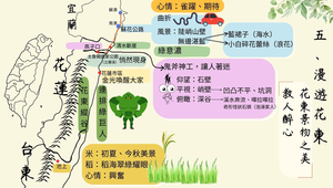 五上南一版第五課「漫遊花東」課程地圖,將課程圖像化,使學生對於花東景點的地理位置更加清楚,連結課文內容加強理解。