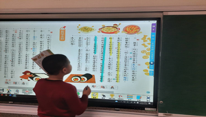 根據教師提問,學生於觸屏上找出關鍵文句進行回答,教師以不同顏色螢光筆、畫筆再進行統整劃記。全班學生跟著教師在觸屏上的重點統整,在自己的課本上畫記。