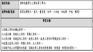 學習內容:S-4-7 三角形:以邊與角的特徵認識特殊三角形並能作圖。如正三角形、等腰三角形、直角三角形、銳角三角形、鈍角三角形。