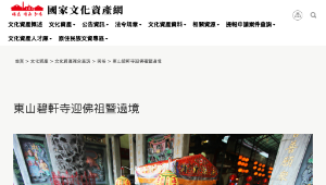 「東山碧軒寺迎佛祖暨遶境」起源於火山碧雲寺因「張丙事件」(1832)而遭燒燬,清道光24年(1844),「番社」(現今東山)庄民不忍觀音佛祖(正二媽)無處安祀,乃合議迎請下山供奉。此後,每年農曆12月23日必恭送佛祖上山,沿著古香路登山攻頂返回火山碧雲寺過年,此即「送駕」;俟元月10日子時,再舉行回駕大典,然後走過黑夜走過山林下山,沿途遶境並進行換香、換花、換轎的「三換儀式」,直至午後回到東山大街入廟並隨即進行市區遶境祈安。到了2月2日至10日再聯合崁頭山仙公廟孚佑帝君與南勢碧蓮寺清水祖師等神,進行為期9天的「十八重溪內」輪巡,一年「溪頭入,溪尾出」,一年「溪尾入,溪頭出」,採「扛轎移交」與「中界迎送」雙軌模式進行,因而連結8里近50個庄頭,形成十八重溪內信仰生命共同體。