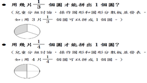 學習內容:N-3-9 簡單同分母分數:結合操 作活動與整數經驗。簡單同 分母分數比較、加、減的意 義。牽涉之分數與運算結果 皆不超過 2。以單位分數之 點數為基礎,連結整數之比 較、加、減。知道「和等於 1」的意義。
