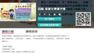 此網頁為哈客網路學院所設立之線上學習課程,課程內容藉由講解作家甘耀明先生之作品為主,有神秘列車、伯公討妾、囓鬼、米田共研發會、微笑老妞等五份作品的解析及探討,透過課程帶領參與者認識客家文化,並有專業教師所編輯之教材,課程適合對文學及客家文化有興趣者共同參與,也可學習如何欣賞文學作品,領會文學之美與客家文化特色,教師可將網站當作課外補充教材,讓學習教材更加多元。