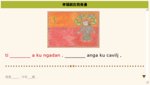 繪本資源源自於「臺東本土語言教材網」此網站由「臺東縣政府教育處」建置以推廣原住民語的學習。繪本資源之《幸福就在我身邊》故事開頭藉由留空白與讀者互動,敘述一個原住民族家庭的相親相愛,以及族人的和善。自學者可以藉由繪本《幸福就在我身邊》來認識繪本中的詞彙和句型。教師可使用繪本資源之《幸福就在我身邊》,來引起學生的學習動機,再介紹繪本中簡單的詞彙和用語,以及讓學生畫下自己的家人,創造屬於自己的幸福就在身邊。透過看圖說故事,可以學習簡單句型並反覆練習,熟習句型結構及單字,在教學上更是老師的好幫手喲!點選分頁後進入到課文,閱讀完課文之後可以按下播放鍵播放課文語音,搭配語音讓學習者反覆練習族語。
