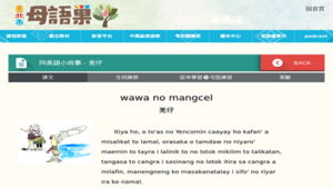 網站為臺北市母語巢提供之線上數位教材,以族語故事的形式分享,本次主題為阿美語小故事「羌仔」,內容講述原住民祖先尋找火種以及羌仔立功的故事,故事除阿美語原文之外也提供中文翻譯對照,並且提供生詞練習與句型練習,也有測驗可以讓學習者測試學習效果。自學者可藉由網站學習阿美語閱讀並練習單字及句型測驗,增加文法及單詞知識,教學者亦可以此為教材或是評量卷使用,並訓練學生閱讀能力。