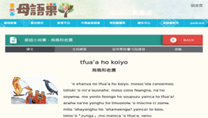 網站為臺北市母語巢提供之線上數位教材,以族語故事的形式分享,本次主題為鄒語小故事「烏鴉和老鷹」,內容講述烏鴉與老鷹彼此互相繪製羽毛的故事,故事除鄒語原文之外也提供中文翻譯對照,並且提供生詞練習與句型練習,也有測驗可以讓學習者測試學習效果。自學者可藉由網站學習鄒語閱讀並練習單字及句型測驗,增加文法及單詞知識,教學者亦可以此為教材或是評量卷使用,並訓練學生閱讀能力。