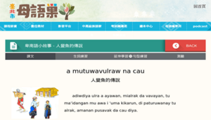 網站為臺北市母語巢提供之線上數位教材,以族語故事的形式分享,本次主題為卑南語小故事「 人變魚的傳說」,內容講述從前一位卑南長老的女兒如何變成魚的故事,故事除卑南語原文之外也提供中文翻譯對照,並且提供生詞練習與句型練習,也有測驗可以讓學習者測試學習效果。自學者可藉由網站學習卑南語閱讀並練習單字及句型測驗,增加文法及單詞知識,教學者亦可以此為教材或是評量卷使用,並訓練學生閱讀能力。