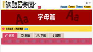 此為東排灣語版的字母學習網站,學習方面提供各音標基本發音,測驗方面提供聽力測驗。