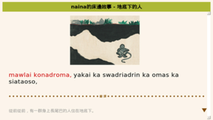 繪本資源源自於「臺東本土語言教材網」此網站由「臺東縣政府教育處」建置以推廣原住民語的學習。繪本資源之《naina的床邊故事 - 地底下的人》故事開頭提到從前從前,有一群身上長尾巴的人住在地底下,地底下的人如果突然想大便,就會拉在臼裡面,他們的大便竟然是一顆一顆的琉璃珠。這個故事跟魯凱族的文化特色-琉璃珠息息相關。自學者可以藉由繪本來認識魯凱族的文化特色,並且認識繪本中的詞彙和句型。教師可使用繪本資源之《naina的床邊故事 - 地底下的人》,來介紹琉璃珠為魯凱族的文化特色,並且補充魯凱族相關的文化,還有介紹繪本中簡單的詞彙和用語。