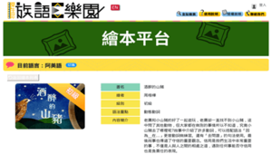 繪本平台之繪本資源源自於「族語E樂園」此網站由原住民族委員會建置向大眾推廣原住民語學習。平台資源之《山豬在做什麼》繪本以一個個「看見......在......」句型的使用,以及「山豬想......可是山豬不會......」與他人不斷比較的過程,到最終了解、肯定自我的能力,不僅是教導孩童動態動詞的使用方式,更是為了告訴讀者:「別透過與他人的比較來定義自己」的重要性。
