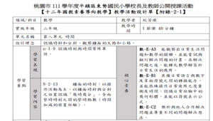 學習內容:N-2-13 鐘面的時刻:以操作活動為主。以鐘面時針與分針之位置認識「幾時幾分」。含兩整時時刻之間的整時點數(時間加減的前置經驗)。