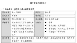 情意:學生能思辨並舉例何謂「無心的錯誤」,最後透過延伸文本反思自身經歷並修正,了解到要以嚴謹的態度面對生活,凡事三思而後行。