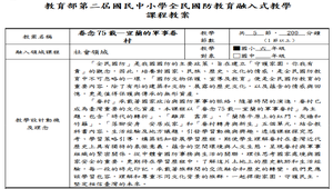 「眷村」承載著國家政治與國防軍事的脈絡,隨著時間的演進,眷村已成為臺灣重要的文化資產。本課程以「眷念75載—宜蘭的軍事眷村」為主題,包含「時代的轉折」、「離岸 靠岸」、「蘭陽平原上的紅門、灰牆和竹籬」、「落腳安身 安居成家」和「眷村轉身與新生」五個單元,結合教科書內容、生活經驗及地方議題,引發學習動機與興趣。透過課程探究思考、學習策略引導,構築認知發展學習歷程。期使學生理解眷村在臺灣近代歷史上具有獨特的象徵意義,蘊含的空間環境與人文生態,呈現眷村與軍事組織的緊密關係。從中體會國防事務與生活的關聯,理性思考國家處境與國家安全的重要。更期待在學習歷程中,了解這片土地上的歷史軌跡和生活經驗,每一段的時光印記,承載著族群間的交流融合和歷史的轉變。我們更應該學習包容,理解和尊重不同文化背景的族群,一起捍衛家園,守護民主,堅定相信臺灣的未來。
