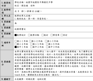 本單元實施對象為七年級學生;初入國中,尚未熟悉校園環境。為了讓學生認識校園、提升對學校的認同感,設計一系列校園探索單元;本單元將認識校園分為認識處室功能與發現校園特殊景點兩大部分;認識校園處室功能部份,運用賓果遊戲讓學生知悉各處室的業務內容。在發現校園特殊景點部分則欲透過設計校園尋寶圖讓學生發現校園特別之處,並根據設計尋寶圖所需的技能分成觀察、地圖判讀、追蹤記號;藉由課程活動讓學生習得上述技能、完成一張校園尋寶圖,讓學生自行發掘校園的美好。