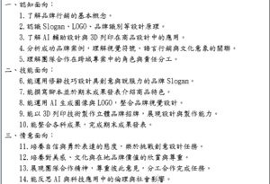 本課程以「跨域行銷 × 新興科技」為主軸,融合語文表達、視覺設計、品牌形象、3D列印實作與AI創新技術,旨在讓學生從品牌概念出發,體驗商品從創意發想到品牌行銷的完整流程。課程設計以「跨群科協作」為核心,整合國文科、英文科、數學科、國貿科、美術科與資處科等學科專長,強調語言力、設計力與科技力的整合應用。