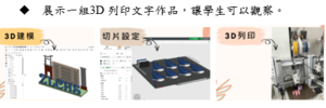 新興科技的導入以AI輔助設計、3D多色列印實作為主,學生能實際操作AI生成商品圖像、輔助LOGO設計,將品牌形象視覺化。同時能利用3D列印技術製作店家招牌,將行銷創意具象化。課程延伸學校「跨域行銷力」校本課程精神,結合下學期園遊會販賣商品,讓學生透過科技創意實作跨域行銷企劃,展現本校具特色的創新課程。