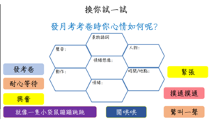情緒詞彙的具象化與鷹架搭建(結合 SEL 與寫作): 抽象的情緒對於三年級學生來說較難精準描述。本課程運用「溫老師心情板」作為學習鷹架 ,引導學生跨越僅會使用「開心、難過」等籠統語詞的障礙。透過討論與聯想,協助學生找到精確的形容詞與譬喻修辭來形容情緒,這不僅是寫作訓練,也是引導學生察覺與辨識自我的情緒教育過程。
