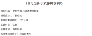 介紹小米酒於文化之重要性。介紹釀酒背後之科學,並盎學生動手實作結合探究與實作,讓學生對於呼吸作用及影響因素有更深入的理解。過程需使用到智慧黑板來呈現實驗結果。