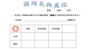 國小幾何學習著重在實際操作,學生從實作結果獲知直徑、半徑、及圓心的定義。由實測的結果得知直徑是半徑的兩倍,圓周長是直徑的三倍多。進一步帶到校園實作步道的題目,使數學學習落實在日常生活中。