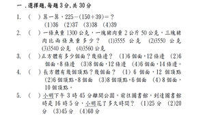 本試題設計範圍涵蓋 “幾何立體型體”.”數目和單位化聚”.”時間加減”.”整數四則運用”.希望從多方面的題型設計變化中,讓學生能夠靈活的運用自己所學的的基礎概念,釐清自己所困惑的地方加以改正,並能測驗出學生的實力程度.