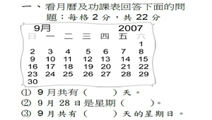 (一):藉由此次評量了解學生能否認識及查閱月曆(知道本月有幾天?幾月幾日是星期幾?某一個星期幾是幾月幾日?)。(二):藉由此次評量了解學生能否報讀含有『星期幾』的簡單一維表格(例如功課表)。(三):學生是否能運用兩步驟的加減法,或加減混合來解決問題。(四):學生是否有能力用一個算式紀錄兩步驟的加減法,或加減混合來解決問題。(五):學生是否有能力應用結合律簡化計算。(六):了解學生能否運用全等的圖形版拼出指定的圖形。(七):了解學生能否依給定圖形,將簡單形體作立體堆疊,並能判斷這些積木是否可以堆疊得起來?(八):了解學生的各單元學習情形,以進行評量後的補救教學。