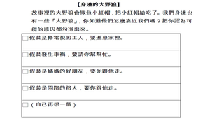 本教案主要目的是透過學習單讓學生了解故事裡的大野狼會欺負小紅帽,把小紅帽給吃了。也讓學生了解我們身邊也有一些「大野狼」。